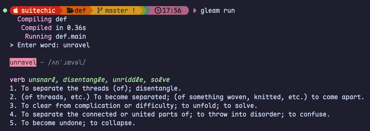 Fast forward a bit and I find Shore, a Gleam TUI Framework. I am familiar with Charm's Bubbletea for Go, and this seems a bit similar to that. Both are based on The Elm Architecture functional design paradigms. I immediately knew I needed to make something with it, and this dictionary app seemed like the perfect thing initially. Plus it gave me the opportunity to write something in pure Gleam.