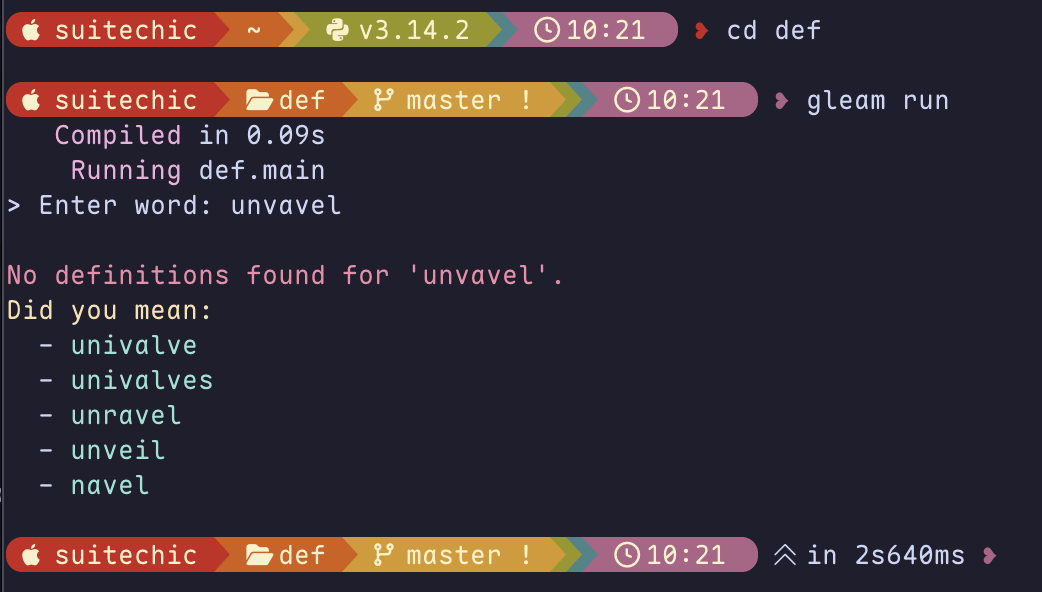 This implementation is in pure Gleam, but I did add an Erlang package called jaro_similarity to find similarities to mispelled or not found words from a txt file (can be stored locally and retrieved with simplifile).