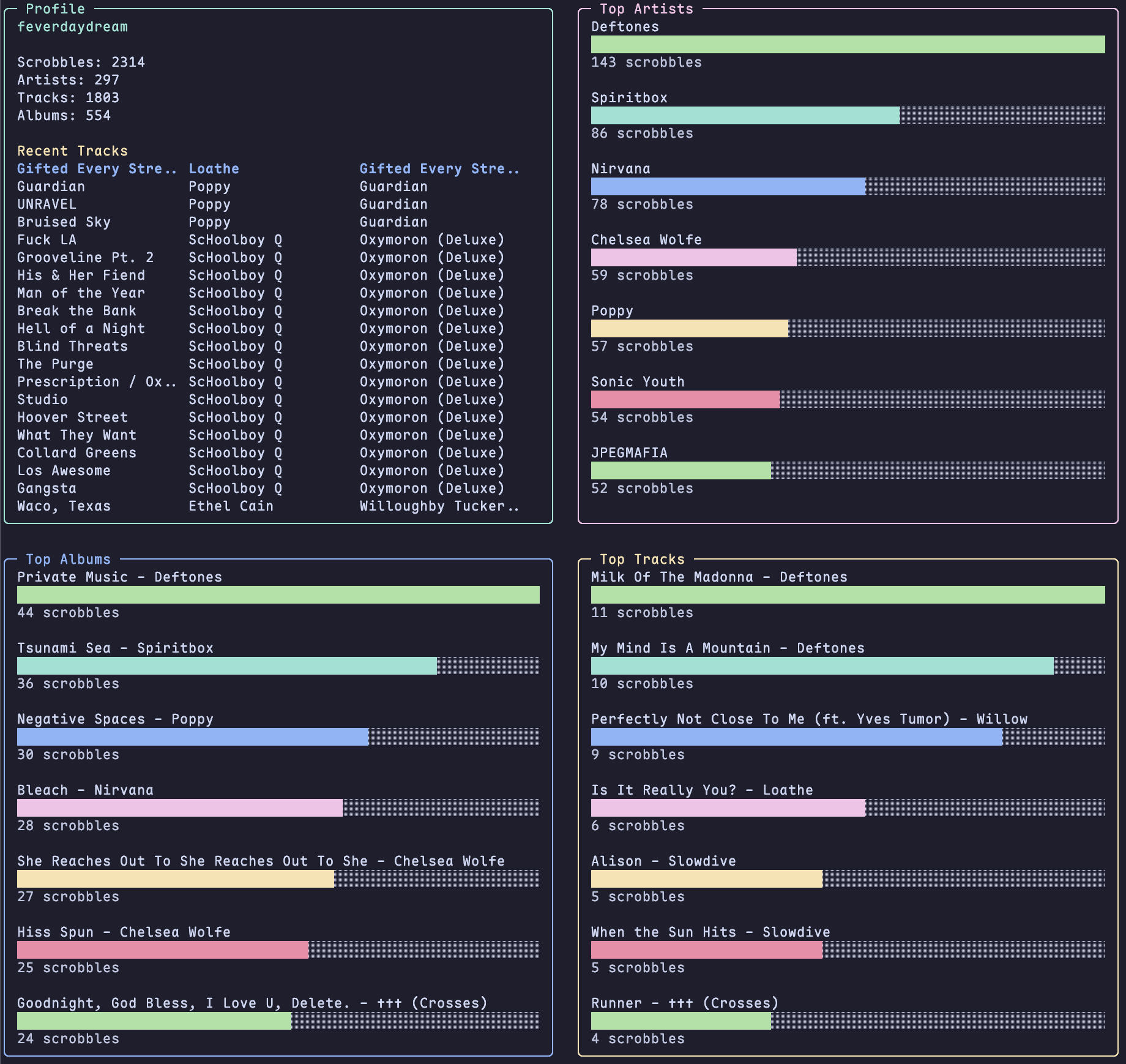 I couldn't stop there though, as I woke up with the idea to make a TUI that makes even better use for Shore and shows your last.fm top stats with progress bars. The recently played tracks are displayed with Shore's table function. This also utilizes the argument function from above. An extended version instead includes a fake login (mimicking the Last.fm login page) that receives the username (password field can be anything or left blank) for fetching the stats.