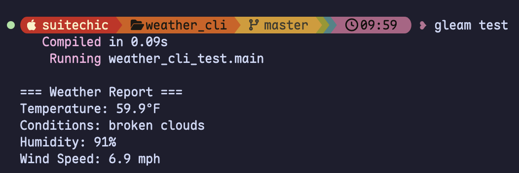 This time instead of a prompt input I used argv to accept city arguments like -- New York. By default when running gleam run the weather data it returns is from Orlando, Florida. I also had to deal with an API Key to use the Open Weather API which I stored in an .env file while using dot_env to obtain it.